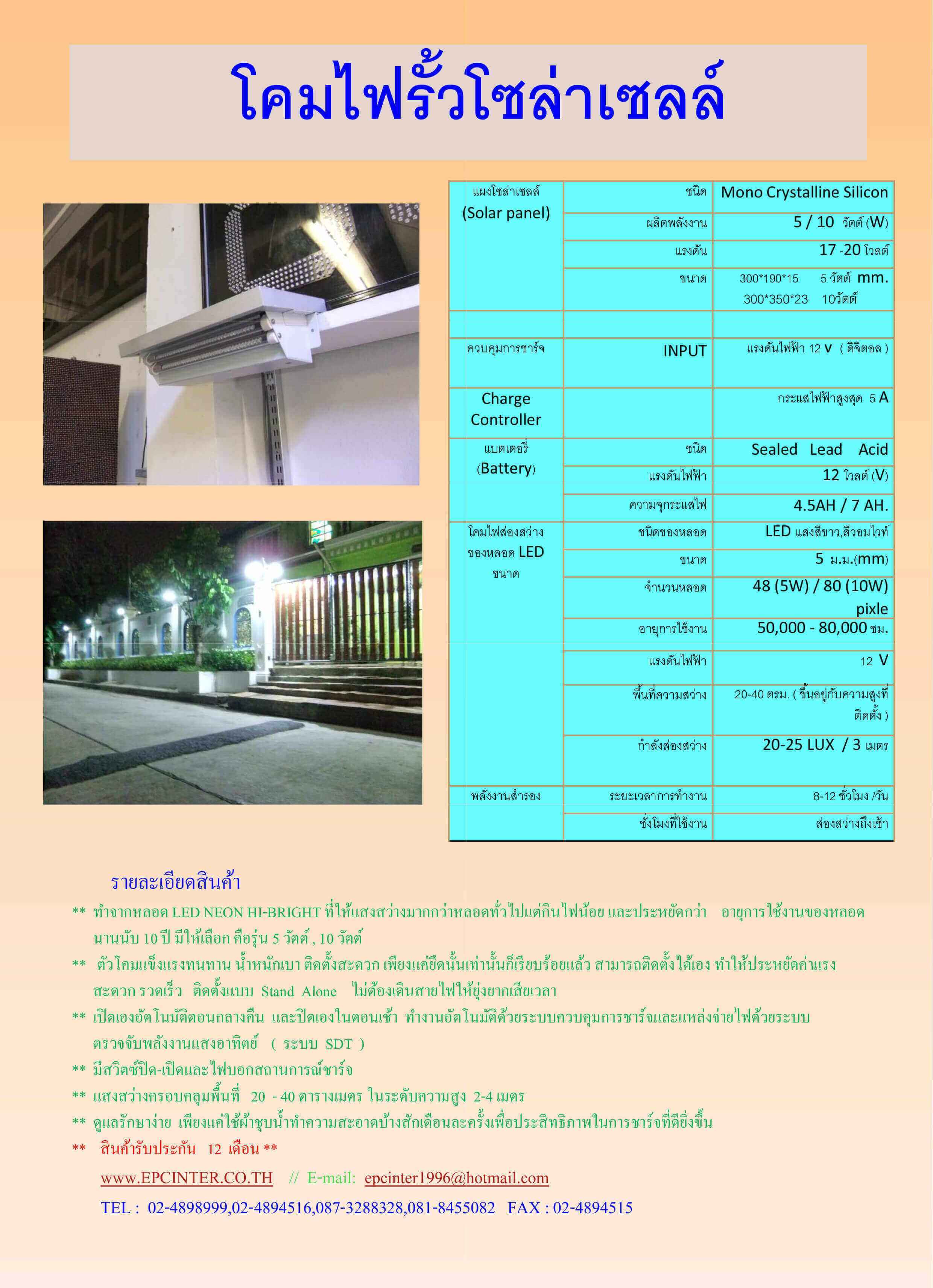 5 . เปิดเองโดยอัตโนมัติในเวลากลางคืน ปิดเองในตอนเช้าและชาร์จแบตเตอรี่โดยแผงโซล่าเซลล์ ( ทำงานอัตโนมัติเต็มรูปแบบ )