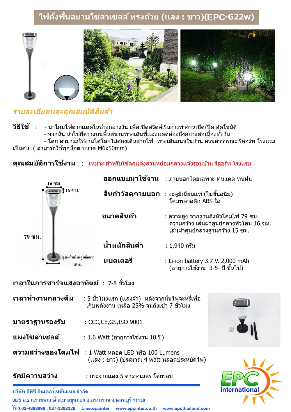 คุณสมบัติการใช้งาน : เหมาะ สำหรับใช้ตกเเต่งสวนหย่อมกลางเเจ้งรอบบ้าน รีสอร์ท โรงเเรม โดยเป็นบริเวณที่เเสงเเดดส่องถึงตลอดเวลาในช่วง กลางวัน การทำงานของโคมไฟโซล่าเซลล์จะทำงานเองโดยอัตโนมัติเมื่อเเสงมืดลง เพียงเเค่ยึดติดพื้นที่ผิวเรียบเเละเเสงเเดดส่องถึงตลอดทั้งวัน