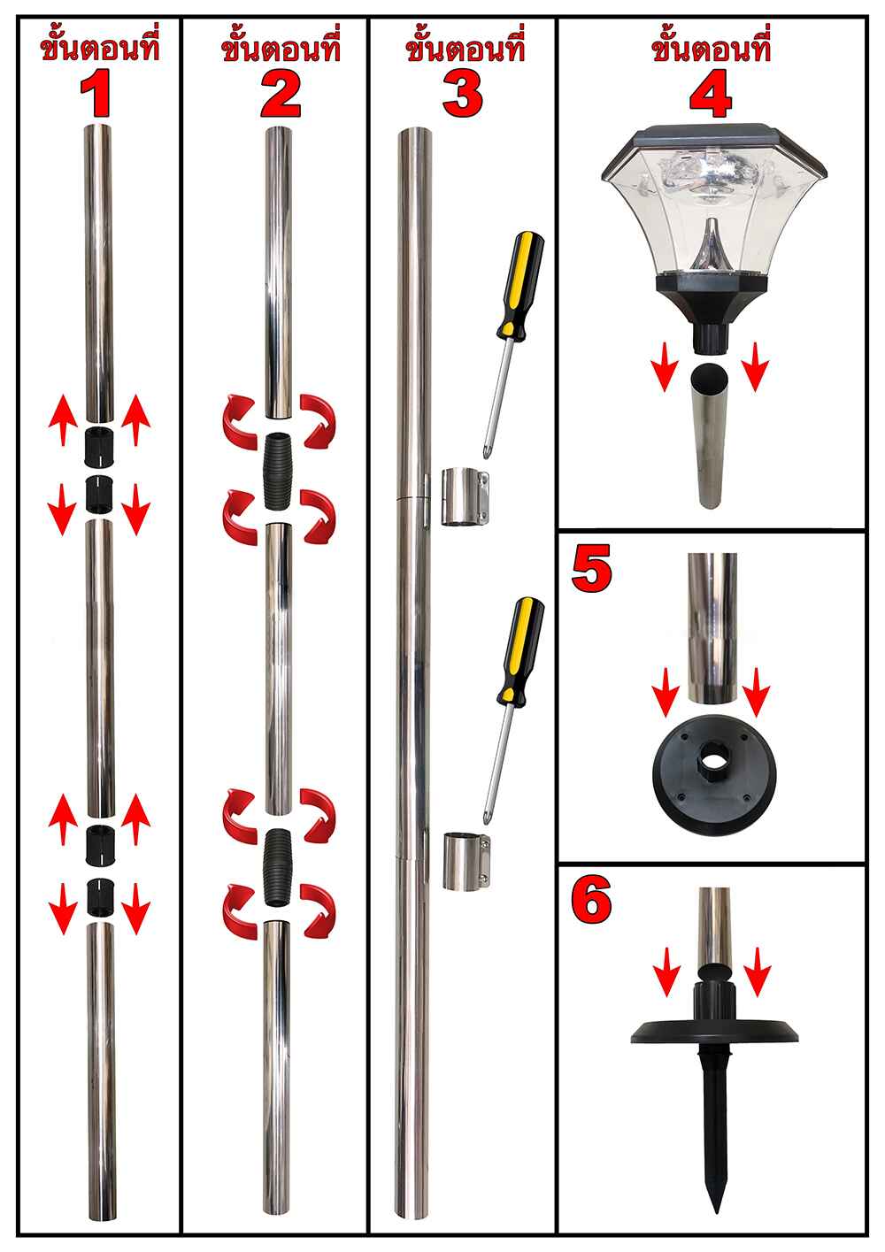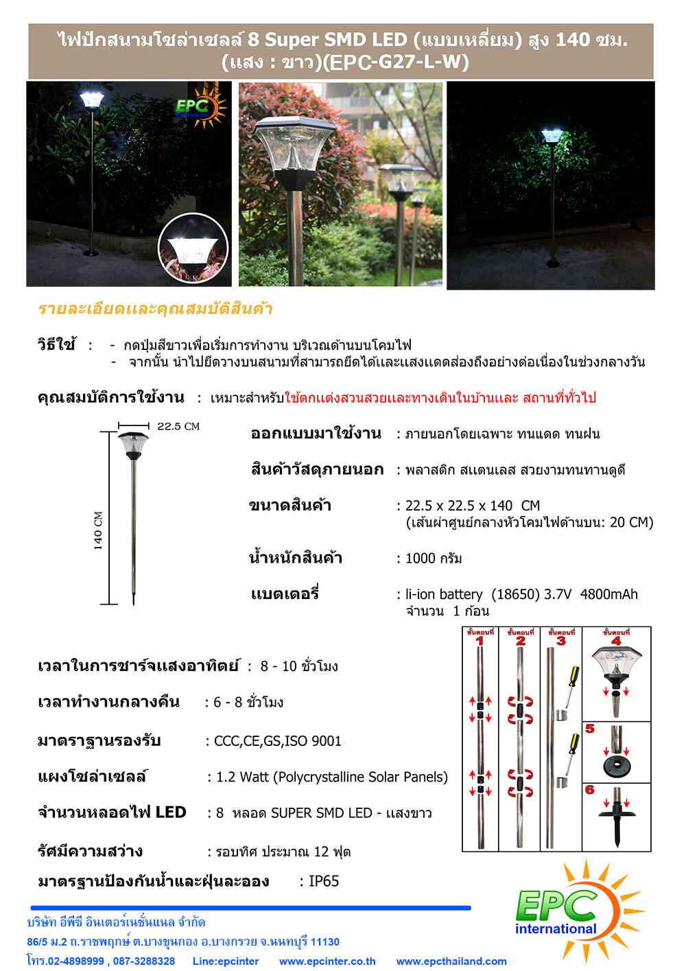 เวลาทำงานช่วงเวลากลางคืน : 6 - 8 ชั่วโมง (ไฟติดทำงานอัตโนมัติเองทุกวัน)